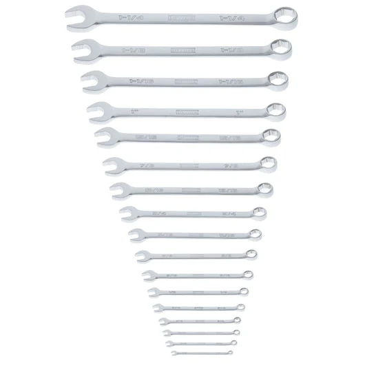 This professional-grade kit includes (17) SAE TOUGHSERIES Combination Wrenches ranging from 1/4 in. to 1-1/4 in. sizes, all housed in a heavy-duty, reinforced roll pouch with integrated size labels and secure straps for portable organization.