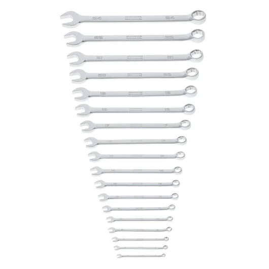 Take on a wide range of tough demands. From the shop to the jobsite, the DEWALT TOUGHSERIES 18-Piece Metric Combination Wrench Set includes wrenches featuring powerjaw technology that allows for 30% more torque on rounded fasteners*. These wrenches have a 15 degree offset to provide access in tight spaces and long panel forging designed to maximize torque. The set comes with a convenient roll pouch for organization and portability.