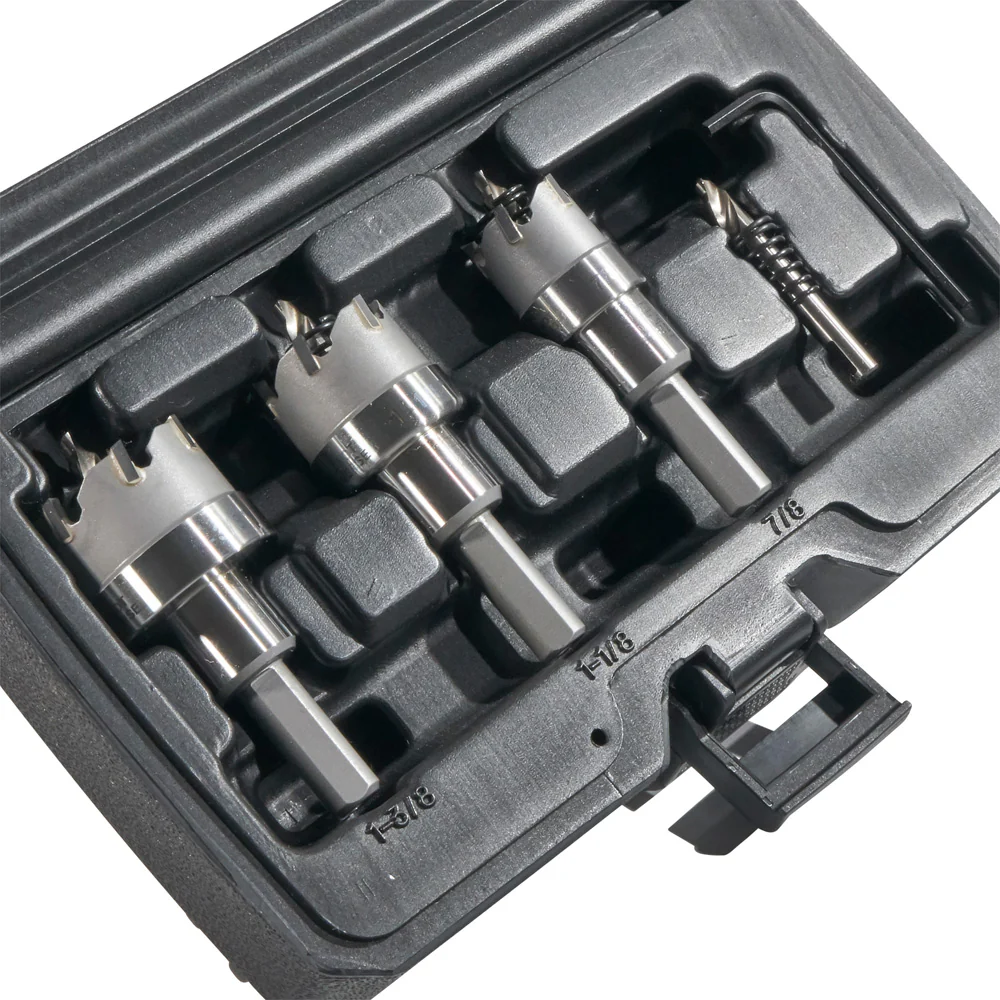 This 4-piece Carbide-Tipped Hole Cutter kit cuts quick, precise holes in a variety of materials. Set includes three commonly used sizes plus an extra pilot bit. Integrated flange prevents the operator from drilling beyond the sheet metal. Split point pilot drill bit prevents bit walking.