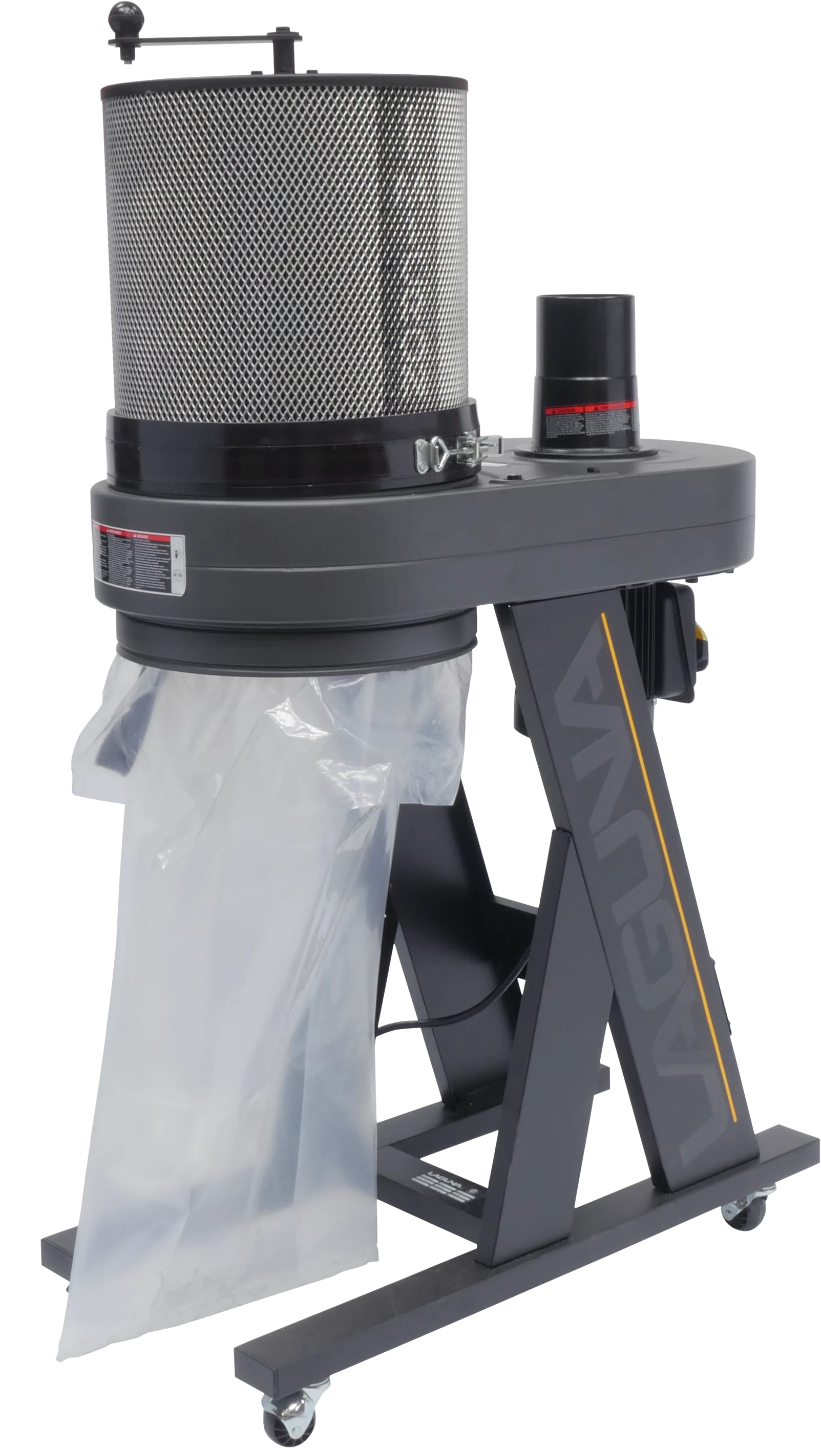 The best looking single stage dust collector to hit the market in years. Sleek design and power to match. No more fumbling with a steel band to mount your lower bag, the B|Flux comes with a patented Snap-Band that makes changing the bag a breeze. Unlike most 1HP units the B|Flux feels solid & has a low dB rating. The horizontal dust chute provides optimum airflow & can swivel 180° to make the 4″ outlet face downwards. The B-flux dust collector can be oriented with the inlet port pointed up or down.