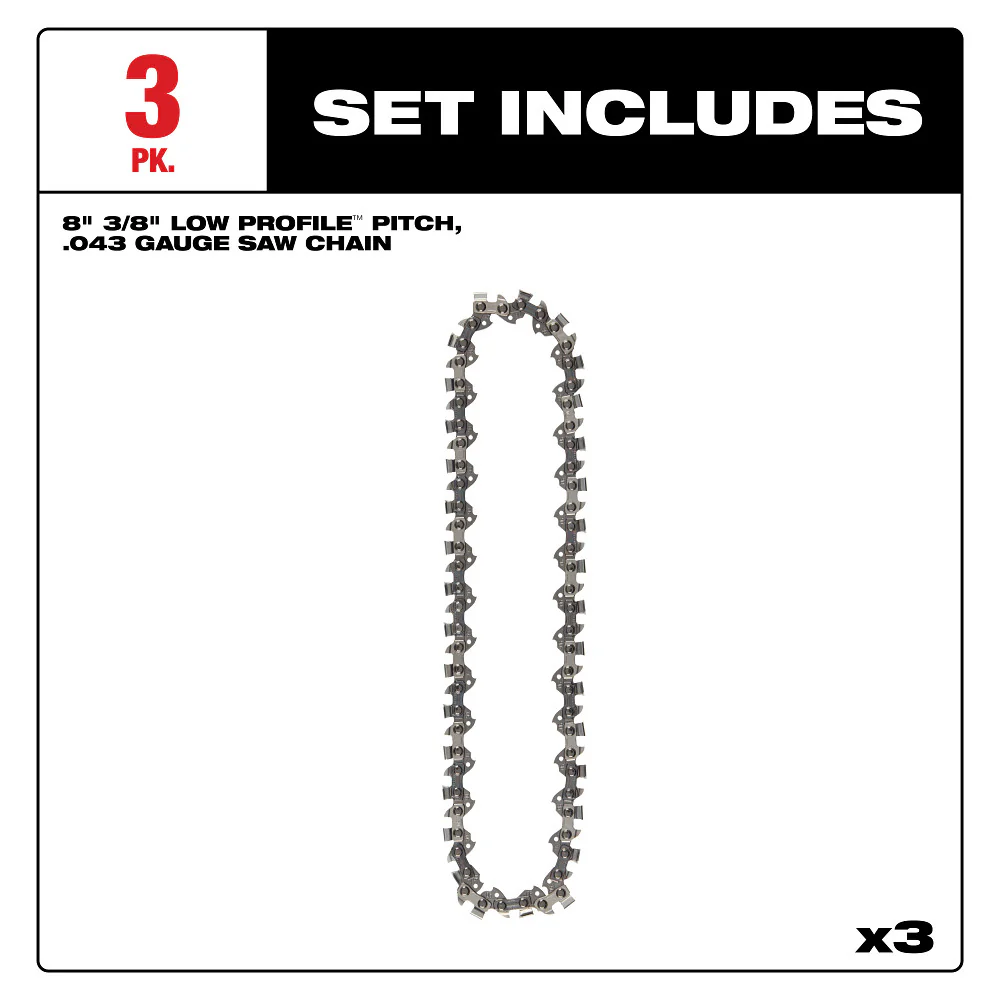 Milwaukee 8" 3/8" LOW PROFILE™ Pitch .043" Gauge Saw Chain 3-Pack for M18 FUEL HATCHET 49-16-2817